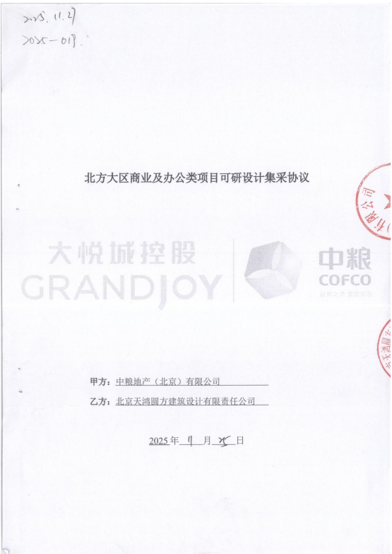开发商名称: 大****集团股份有限公司 战略合作名称: 中****北京)有限公司北方大区商业及办公类项目可研设计集采协议 战略合作类别: 建筑/规划设计 战略合作期限: 2025年11月25日至2027年11月25日 战略合作范围: 合作范围:中粮地产(北京)有限公司北方大区商业及办公类项目在获取前需要进行的支持立项及可研阶段的概念方案设计,包括新建类及城市更新类。