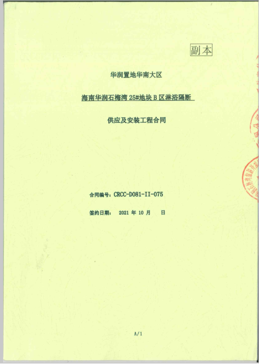 | 项目名称: | 海南华润石梅湾25#地块B区淋浴隔断供应及安装工程合同 |