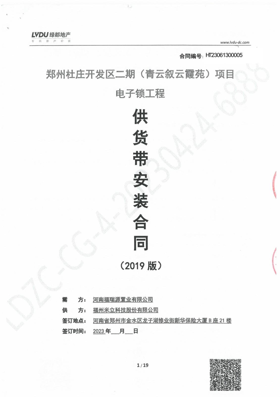 甲方名称: 河***源置业有限公司 项目名称: 郑州杜庄开发区二期(青云叙云霞苑)电子锁工程供货带安装 招标名称: 郑***开发区二期(青云叙云霞苑)电子锁工程 项目地点: 郑州 中标时间: 2023年08月01日 中标范围: 电子锁< ...... [登录可见]