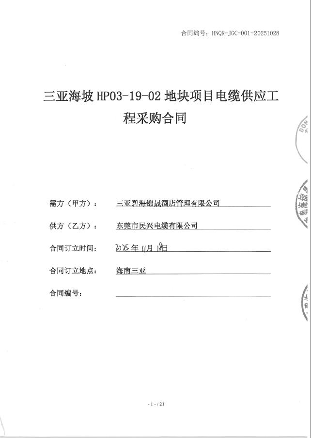 甲方名称: 三***锦晟酒店管理有限公司 项目名称: 三亚海坡HP03-19-02地块项目电缆供应工程 招标名称: 三***HP03-19-02地块项目电缆供应工程 项目地点: 三亚 中标时间: 2025年11月18日 中标范围: 三亚海坡HP03-19- ...... [登录可见]