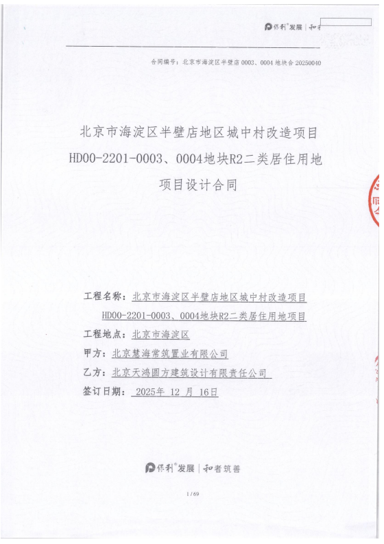 甲方名称: 北***常筑置业有限公司 项目名称: 【保利·半壁店】北京市海淀区半壁店地区城中村改造项目HD00-2201-0003、0004地块R2二类居住用地项目 招标名称: 北***淀区半壁店地区城中村改造项目HD00-2201-0003、0004地块R2二类居住用地项目(方案设计、初步设计、施工图设计)中标结果公示 项目地点: 北京 中标时间: 2025年10月15日 中标范围: 中标范围:北京市海淀区半壁店地区城中村改造项目HD00-2201-0003、0004 ...... [登录可见]