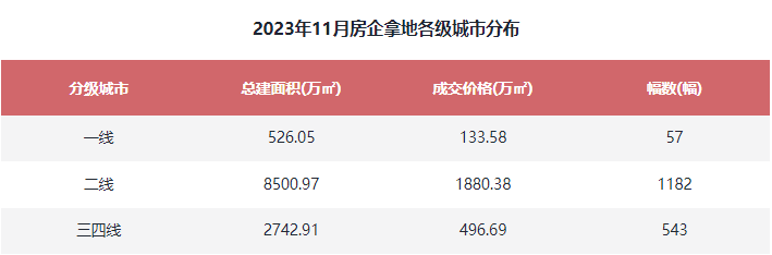 根据优采大数据云平台监测的房企拿地数据,2023年11月一线城市总建面积526.05万㎡,占比4.47%;二线城市总建面积8500.97万㎡,占比72.23%;三四线城市总建面积2742.91万㎡,占比23.3%。