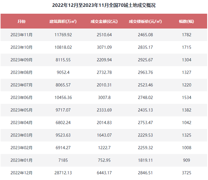 根据优采大数据云平台监测的土地数据,2023年11月全国70城经营性土地数据共成交1782幅,环比3.91%;成交建筑面积11769.92万㎡,环比8.8%;成交总价2510.64亿元,环比-18.25%。