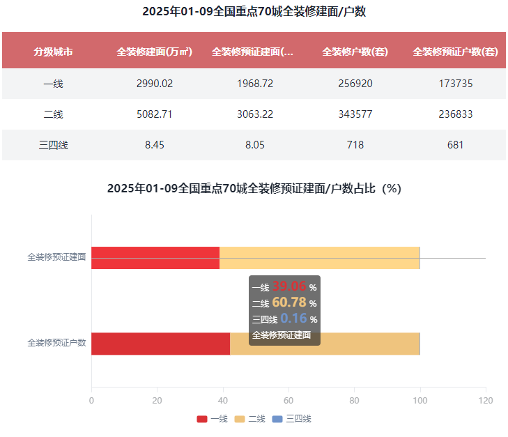 2025年1-9月全国重点70城全装修项目规划建面为8081.16万㎡,全装修预证建面5040万㎡,预证建面占比41.34%;全装修规划户数为60.12万套,全装修预证户数41.12万套,预证户数占比24.09%。其中,二线城市全装修预证建面为3063.24万㎡,占全装修预证总建面25.13%;全装修预证户数为23.68万套,占全装修预证总户数的24.09%。