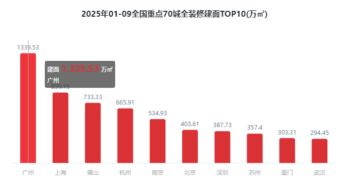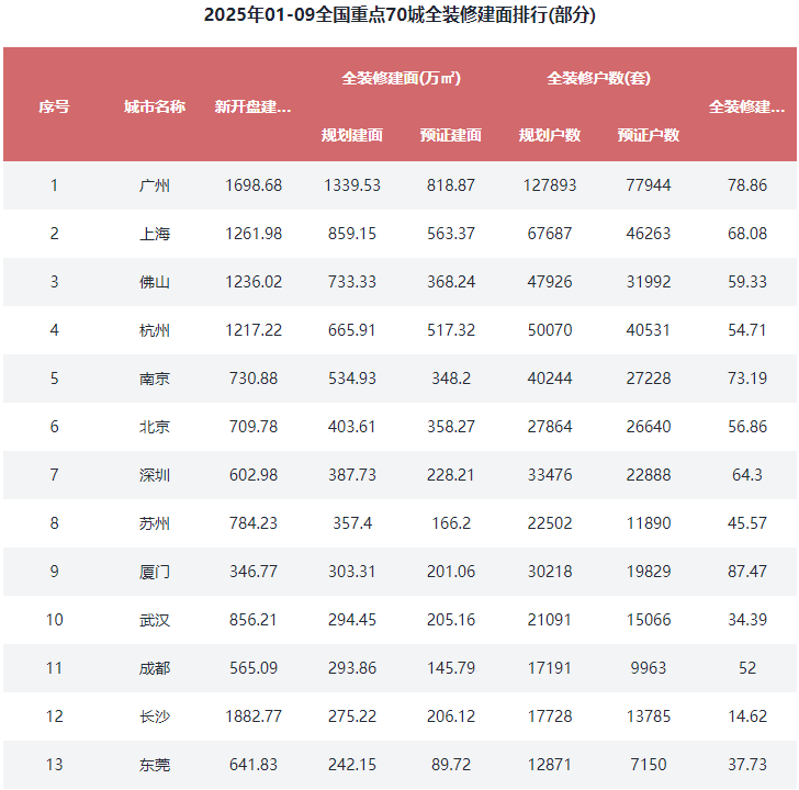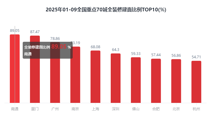 在全国重点70城全装修建面比例方面,2025年1-9月全装修比例TOP10城市有6席是二线城市,其中排在前3位的城市分别是南通89.05%、厦门87.47%、广州78.86%。