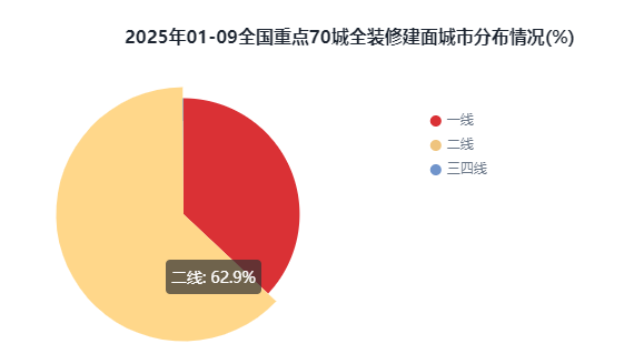 在全国重点70城全装修建面规模方面,2025年1-9月全装修建面TOP10城市有6席是二线城市,其中排在前三位的城市分别是广州1339.53万㎡、上海859.15万㎡和佛山733.33万㎡。对比全装修建面在各分级城市的分布来看,二线城市全装修建面为5082.71万㎡,以62.9%占比居首位;一线城市全装修建面为2990.02万㎡,占比为37%次之; 三四线城市全装修建面8.45万㎡,占比仅为0.1%最少。