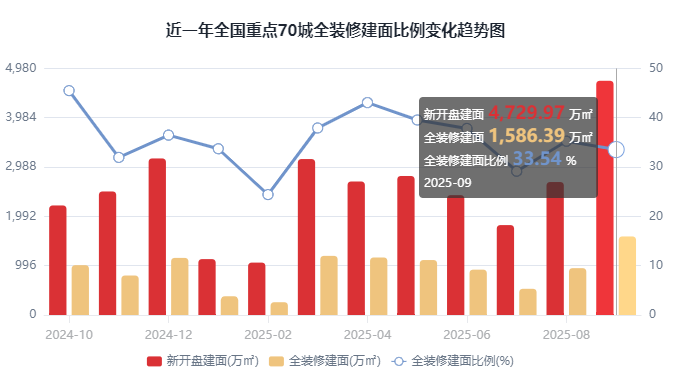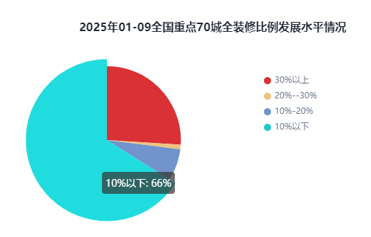 综上,2025年1-9月全国重点70城全装修项目规划建面为8081.18万㎡,全装修预证建面5040万㎡,预证建面占比41.34%。此外,全装修比例TOP10城市有6席是二线城市,全装修比例达到30%的城市占比为26%,未达到30%的城市占比为74%。