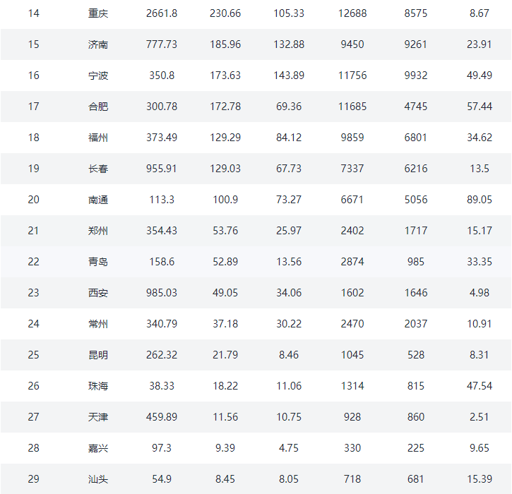 ②.二线城市:常州、成都、大连、东莞、佛山、福州、贵阳、海口、杭州、合肥、惠州、济南、嘉兴、金华、昆明、兰州、南昌、南京、南宁、南通、宁波、青岛、厦门、沈阳、石家庄、苏州、太原、天津、温州、无锡、武汉、西安、徐州、烟台、长春、长沙、郑州、中山、重庆、珠海(40)个