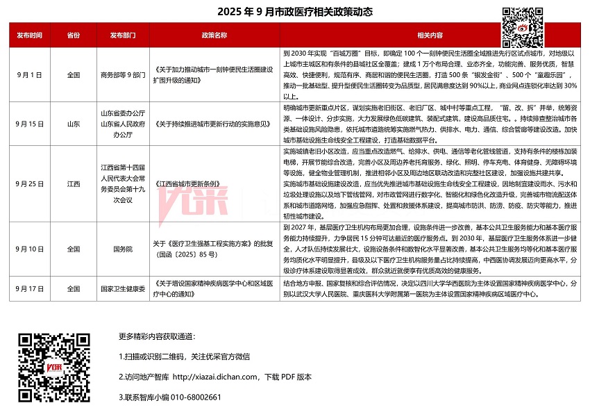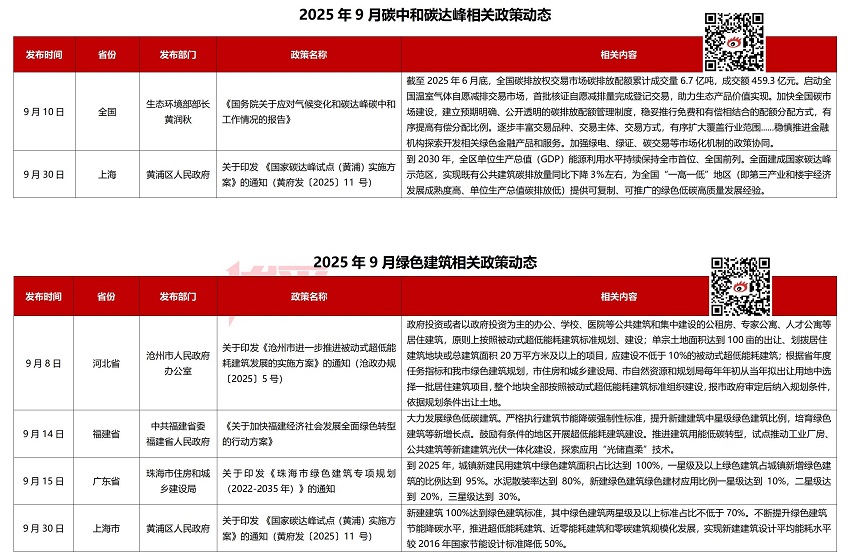[摘要]2025年9月政策动态汇总来了!9月政策搜集17条,碳中和方面,截止今年6月,全国全国碳排放权交易市场碳排放配额累计成交量6.7亿吨,成交额459.3亿元,上海黄浦区提出建设国家碳达峰示范区;绿色建筑方面,河北沧州明确土地出让中须配建不低于10%的超低能耗建筑,广东珠海提出到2025年一星级及以上绿色建筑占比达95%,上海黄埔要求新建建筑100%达到绿色建筑标准;装配式方面,广东确定广州、深圳为综合性模块化建筑试点城市,福建省目标2030年装配式建筑占比达40%,四川推动装配式建筑占比达50%以上;全装修方面,广东东莞加强新建住宅全装修管理,鼓励“菜单式”装修和“样板先行”;市政医疗方面,全国推动“一刻钟便民生活圈”,目标到2030年覆盖100个城市,建成1万个便民圈,山东、江西持续推进城市更新,重点改造老旧小区、基础设施升级和韧性城市建设;全国实施医疗卫生强基工程,提升基层医疗服务能力。