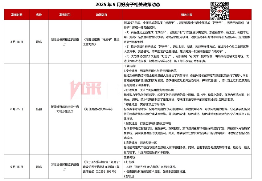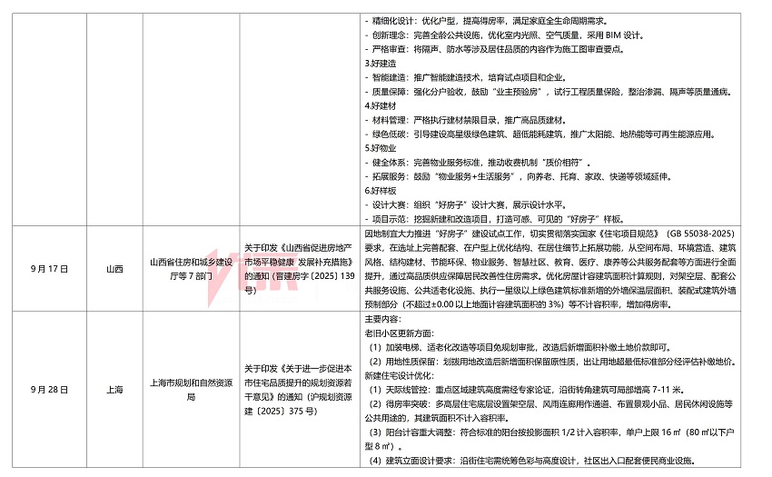 [摘要]2025年9月好房子政策动态来了!9月政策搜集5条。湖北省提出到2027年全面建成高品质“好房子”,新建保障性住房全部建成“好房子”,老房子改造形成一批典型案例;新疆发布好住房建设技术标准,强调防震、防火、防洪等本地化要求;上海明确架空层、风雨连廊不计容,阳台按投影面积1/2计容(单户上限16㎡),简化老旧小区审批流程,加装电梯、适老化改造等项目免于规划许可,新增面积补缴地价即可;河北围绕“六好体系”(好标准、好设计、好建造、好建材、好物业、好样板)推进好房子建设;山西从选址、户型、建材、节能、智慧社区到公共服务配套全面升级,对架空层、是老设施、绿色建筑保温层、装配式外墙等不计容积率,提高得房率。