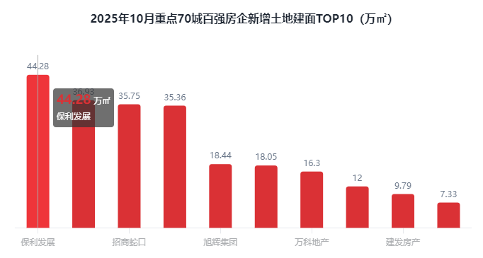 根据优采大数据云平台的监测数据,2025年10月重点70城百强房企新增土地建面255.22万㎡,同比减少33.28%。其中,新增土地建面排在前3位的百强房企分别为保利发展44.28万㎡、越秀地产36.93万㎡ 和招商蛇口35.75万㎡。