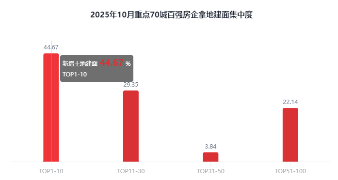 在重点70城百强房企新增土地建面方面,2025年10月新增土地建面前10房企合计拿地234.23万㎡,同比减少25.45%;其中前10房企有4家是TOP1-10梯队房企,排在前三位的房企分别是保利发展44.28万㎡、越秀地产36.93万㎡和招商蛇口35.75万㎡。