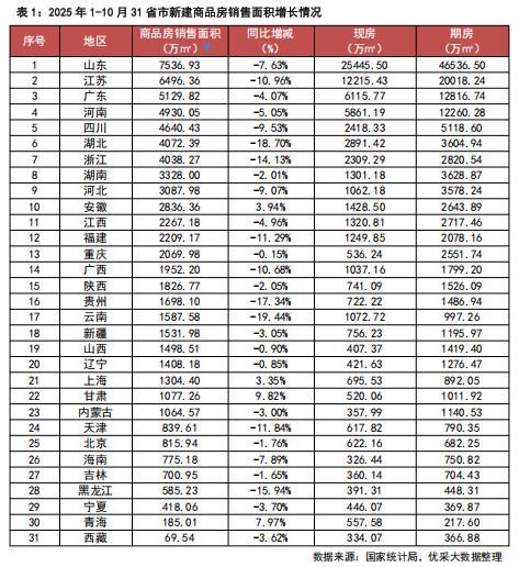根据国家统计局数据,2025年1-10月,31省市的新建商品房销售额69017亿元,同比下降9.6%,其中住宅销售额下降9.4%。新建商品房销售面积71982万㎡,同比下降6.8%,其中住宅销售面积下降7.0%。新建商品房销售面积位列前五的是山东、江苏、广东、河南和四川,其中山东、江苏、广东商品房销售面积超5000万㎡。