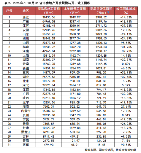 新开工面积方面,31省市1-10月房屋新开工面积共49061万㎡,同比下降19.8%;排名前三的是浙江3949.97万㎡、山东3868.31万㎡和广东3337.41万㎡。竣工面积方面,31省市1-10月房屋竣工面积共34861万㎡,同比下降16.9%;排名前三的是浙江3978.52㎡、广东3199.76万㎡和江苏2711.72万㎡。