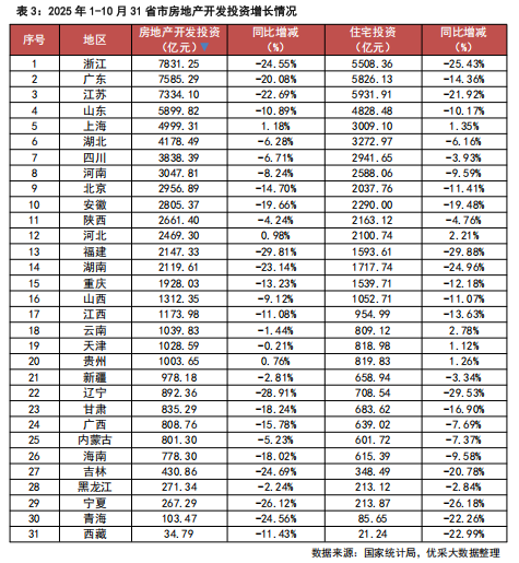 根据国家统计局数据,2025年1-10月,31省市房地产开发投资73563亿元,同比下降14.7%;其中,住宅投资56595亿元,下降13.8%。投资额排名前三的分别是浙江、广东和江苏,分别为7831.25亿元、7585.29亿元和7334.10亿元,投资额均在7000亿以上。西藏投资额最低,仅为34.79亿元。