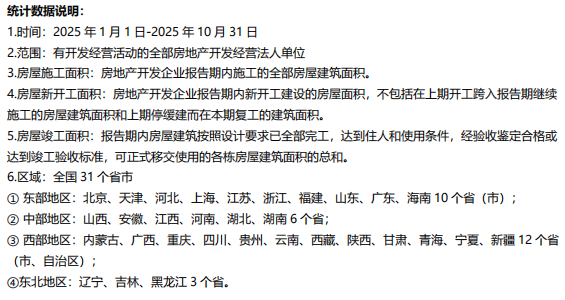 在房地产开发规模与开、竣工面积方面,1-10月房地产开发企业房屋施工面积652939万㎡,同比下降9.4%;其中,住宅施工面积455253万㎡,下降9.7%。房屋新开工面积49061万㎡,同比下降19.8%;其中,住宅新开工面积35952万㎡,下降19.3%。房屋竣工面积34861万㎡,同比下降16.9%;其中,住宅竣工面积24866万㎡,下降18.9%。