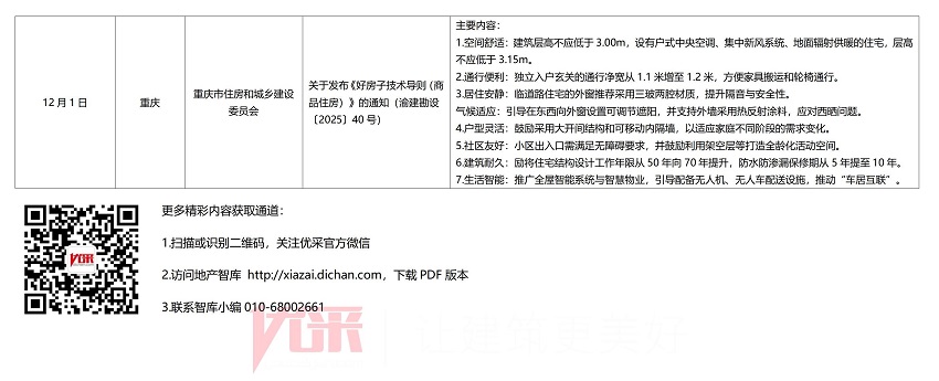 2025年10月好房子政策动态来了!10月政策搜集4条。云南文山以住房公积金贷款额度上浮20%的金融手段,激励居民购买“好房子”及绿色建筑等高品质住宅;山东青岛发布整合超1200项标准的系统性建设体系,为“好房子”提供全周期技术支撑;辽宁大连和重庆市则分别聚焦“好小区”与“商品住房”,作为北方首个“好小区”导则,大连侧重于小区的整体环境、配套设施和公共服务,重庆市强调单套住宅的建筑品质,覆盖设计、施工、运维全周期。