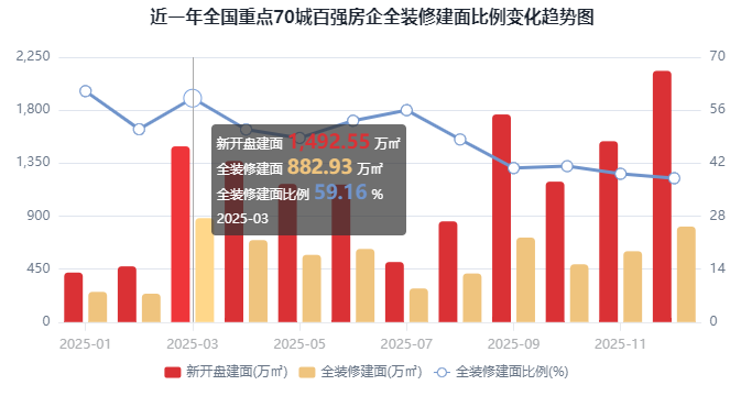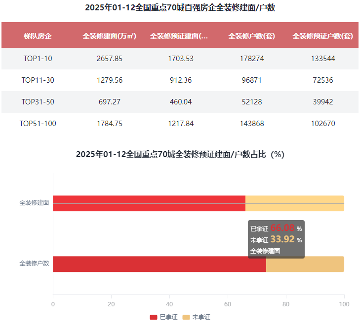在百强房企全装修建面构成方面,2025年1-12月全装修项目规划建面为6589.17万㎡,全装修预证建面4354.2万㎡,占比50.19%;全装修规划户数为48.27万套,全装修预证户数35.34万套,占比50.36%。