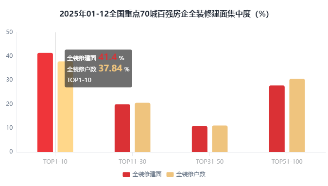 对比全装修建面百强房企集中度来看,TOP1-10梯队房企全装修建面为2657.85万㎡,占比41.4%;TOP11-30梯队房企全装修建面为1279.56万㎡,占比19.93%;TOP31-100房企全装修建面为2482.02万㎡,占比38.66%。