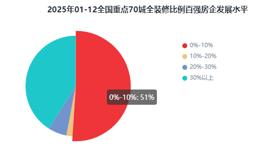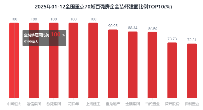 在百强房企全装修建面比例方面,2025年1-12月全装修比例前10房企有7家是TOP51-100梯队房企,其中排在前三位的房企分别是中国恒大100%、融信集团100%、敏捷集团100%。