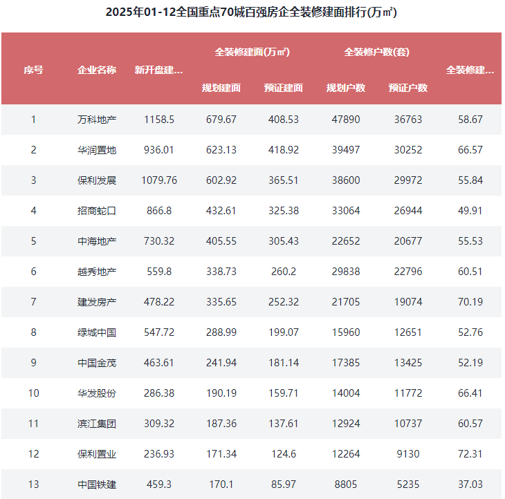 综上,2025年1-12月全国重点70城全装修建面主要集中在百强头部房企,全装修建面前10房企有4家是TOP1-10梯队房企,其中排在前三位的房企分别是万科地产679.67万㎡、华润置地623.13万㎡和保利发展602.92万㎡。