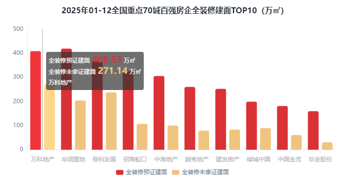 根据优采大数据云平台的监测数据,2025年1-12月百强房企新开盘建筑面积13615.97万㎡,全装修建筑面积6419.43万㎡,同比减少11.06%;全装修建筑户数47.11万套,同比减少10.62%;全装修建面比例为45.57%。其中,全装修建面排在前3位的百强房企分别为万科地产679.67万㎡华润置地623.13万㎡和保利发展602.92万㎡。