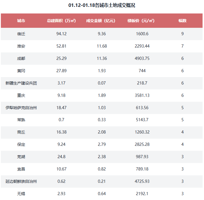 根据优采云平台监测的128城数据,本周土地成交幅数前三的城市分别宿迁94.12万㎡、淮安52.81万㎡、红河哈尼族彝族自治州28.64万㎡。TOP3总建面积为175.57万㎡,环比增加3.19%,成交总价为21.71亿元,环比减少63.57%。