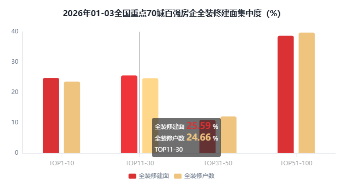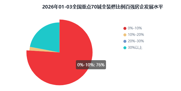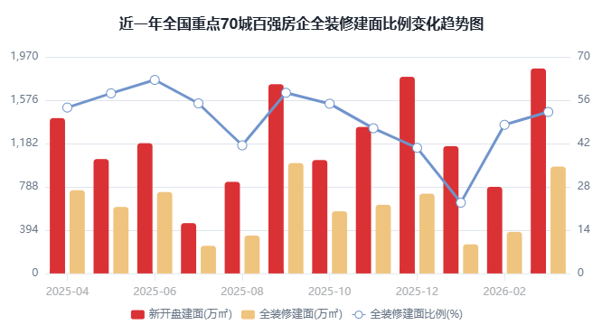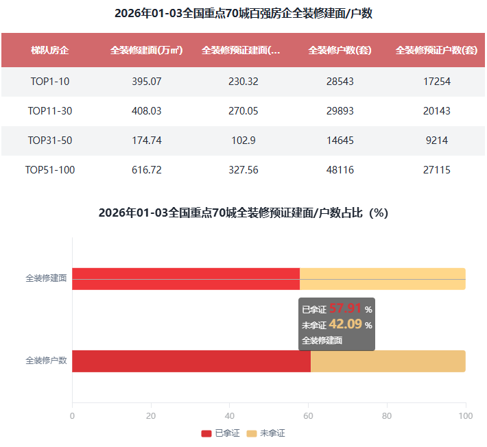 在百强房企全装修建面构成方面,2026年1-3月全装修项目规划建面为1613.18万㎡,全装修预证建面934.13万㎡,占比43.02%;全装修规划户数为12.1万套,全装修预证户数7.34万套,占比41.42%。