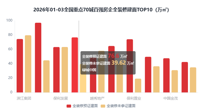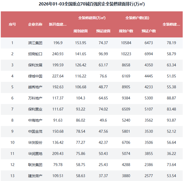 根据优采大数据云平台的监测数据,2026年1-3月百强房企新开盘建筑面积3660.99万㎡,全装修建筑面积1594.56万㎡,同比增加1.24%;全装修建筑户数12.12万套,同比增加5.39%;全装修建面比例为41.89%。其中,全装修建面排在前3位的百强房企分别为滨江集团153.95万㎡招商蛇口141.65万㎡和保利发展126.42万㎡。