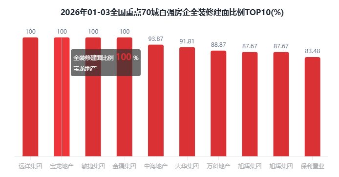 在百强房企全装修建面比例方面,2026年1-3月全装修比例前10房企有4家是TOP51-100梯队房企,其中排在前三位的房企分别是远洋集团100%、宝龙地产100%、敏捷集团100%。