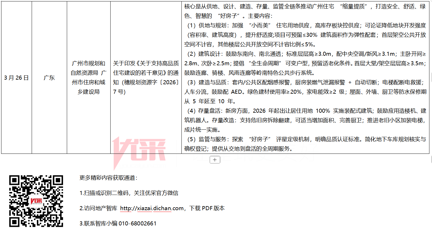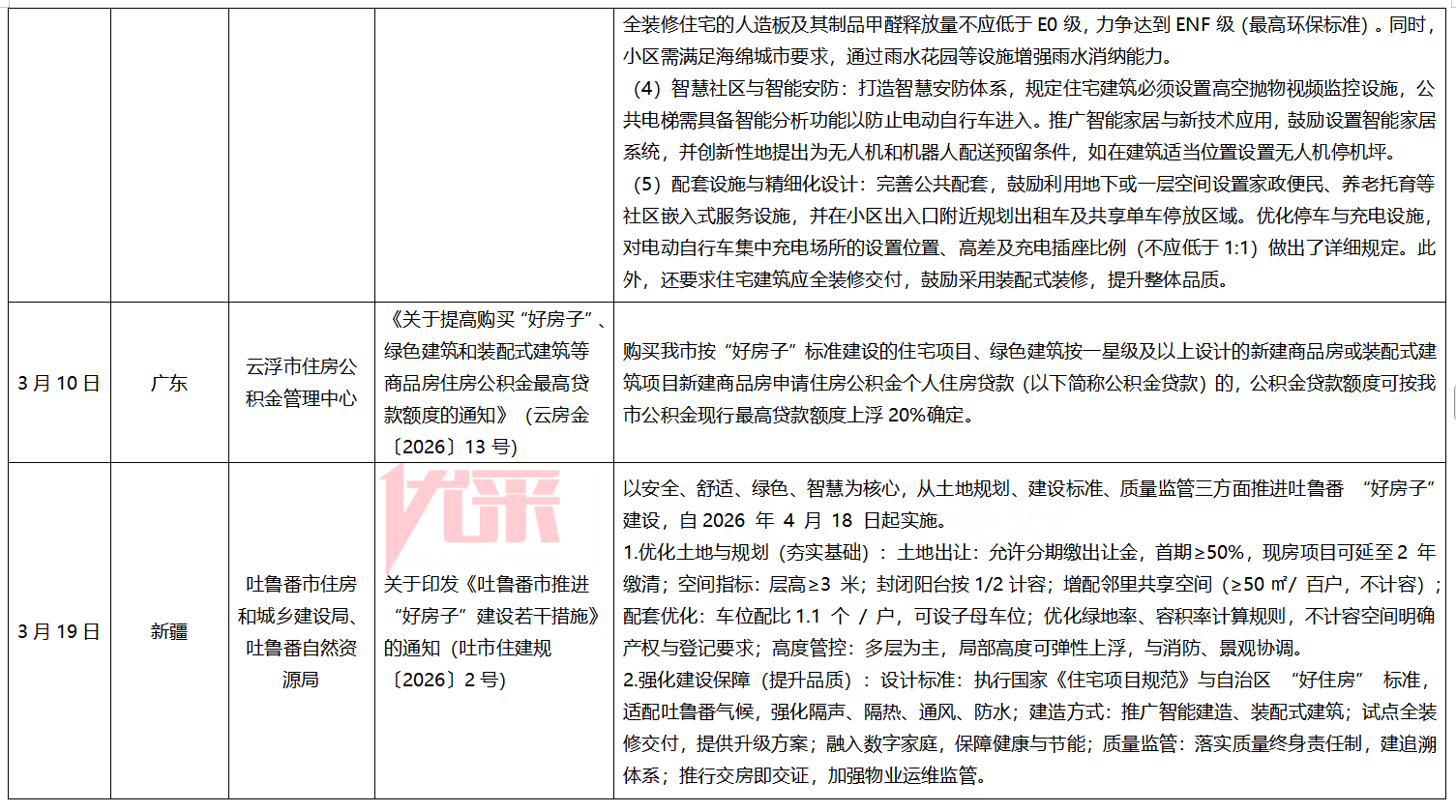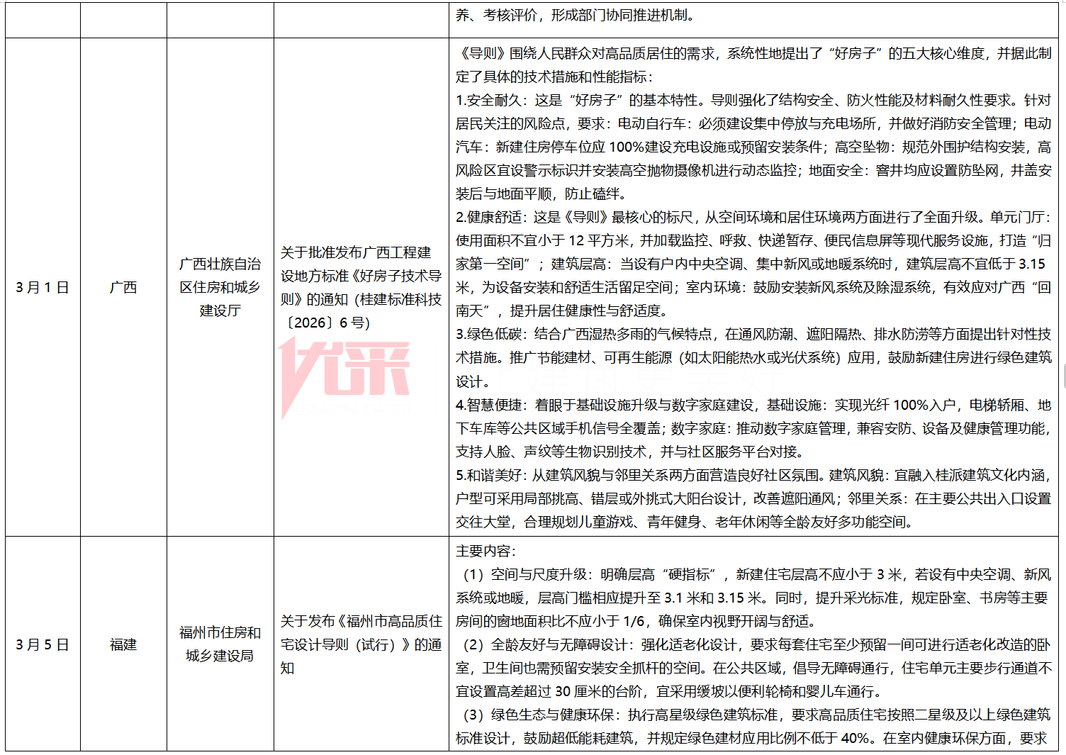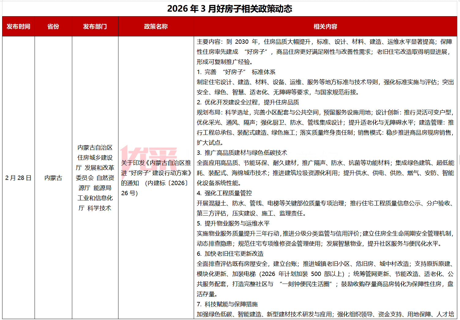 [摘要]2026年3月好房子政策动态汇总来了!3月政策搜集6条,均以安全、舒适、绿色、智慧为“好房子”四大支柱,覆盖新建与存量改造全场景。内蒙古推行灵活可变户型、装配式建造和绿色施工,推进商品房现房销售试点,计划2026年加装电梯500部以上。广西要求带中央空调/新风不低于3.15米、充电设施100%预留、高空抛物监控、数字家庭等要求。福建福州发布高品质住宅设计导则,规定层高≥3米,窗地面积比≥1/6,绿色建材应用比例≥40%等。广东云浮对购买“好房子”、绿色建筑、装配式建筑的商品房,公积金贷款额度上浮20%。新疆吐鲁番允许分期缴纳土地出让金,层高≥3米,封闭阳台按1/2计容,增配邻里共享空间(≥50㎡/百户,不计容)等。广东广州支持高品质住宅建设,降低开发强度,首层架空不计容;层高≥3米,防水保修期延至10年;2026年起出让居住用地100%实施装配式建筑。