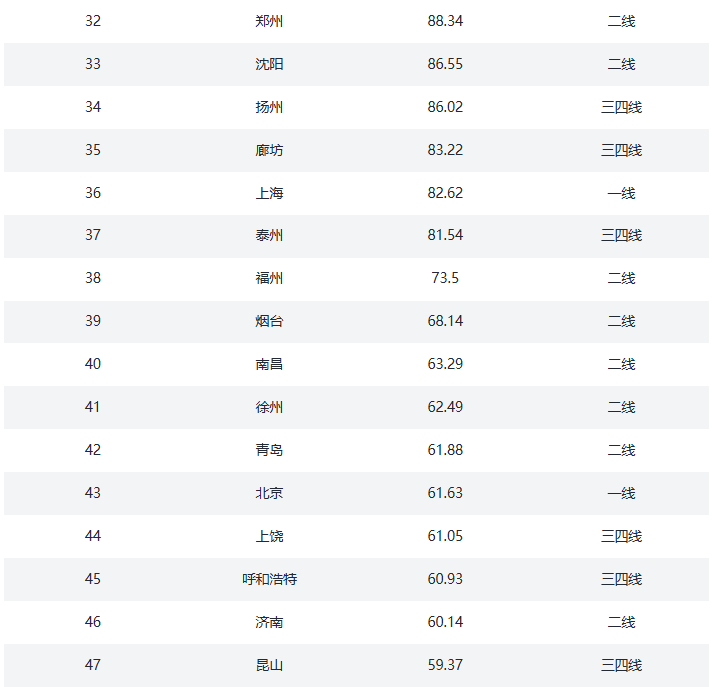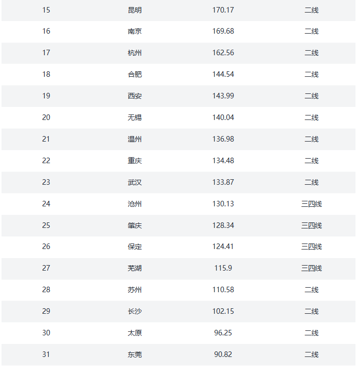 ②.二线城市:常州、成都、大连、东莞、佛山、福州、贵阳、海口、杭州、合肥、惠州、济南、嘉兴、金华、昆明、兰州、南昌、南京、南宁、南通、宁波、青岛、厦门、沈阳、石家庄、苏州、太原、天津、温州、无锡、武汉、西安、徐州、烟台、长春、长沙、郑州、中山、重庆、珠海(40)个