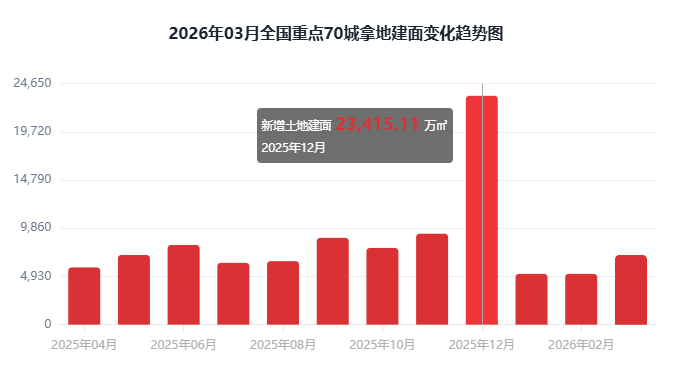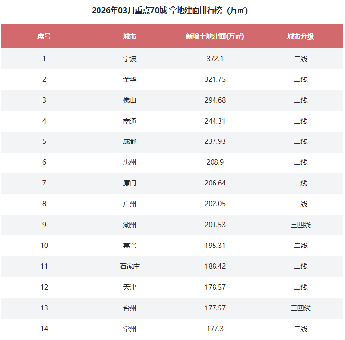 根据优采大数据云平台的监测数据,2026年3月全国重点70城新增土地建面7124.91万㎡,同比增加37.19%。其中,新增土地建面排在前3位的城市分别为宁波372.1万㎡、金华321.75万㎡ 和佛山294.68万㎡。