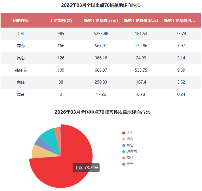 在全国重点70城城市新增土地建面性质方面,2026年3月土地市场共成交1426宗地块,比2025年03月同期增加613宗;新增土地建面7124.91万㎡,同比增加37.19%。其中,纯住宅用地109宗,新增土地建面668.87万㎡,占比9.39%;商住用地38宗,新增土地建面250.83万㎡,占比3.52%;商办用地166宗,新增土地建面567.91万㎡,占比7.97%。