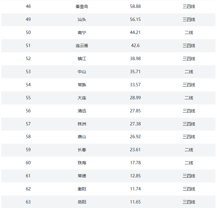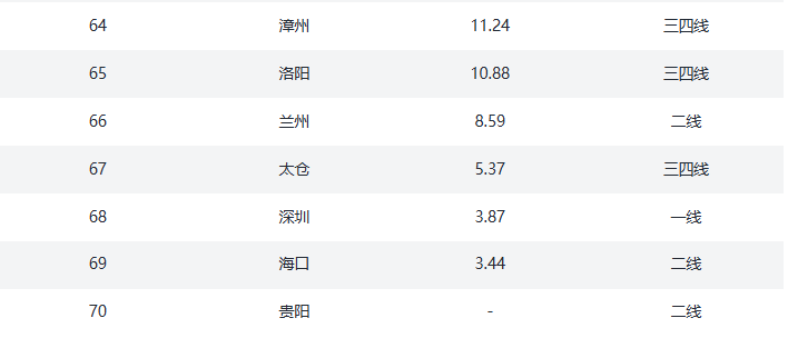 ③.三四线城市:保定、沧州、常德、常熟、衡阳、呼和浩特、湖州、昆山、廊坊、连云港、洛阳、秦皇岛、清远、汕头、上饶、台州、太仓、泰州、唐山、芜湖、扬州、岳阳、漳州、肇庆、镇江、株洲(26)个
