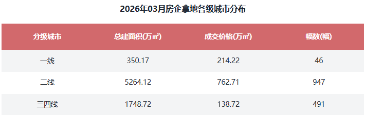 根据优采大数据云平台监测的房企拿地数据,2026年3月一线城市总建面积350.17万㎡,占比4.76%;二线城市总建面积5264.12万㎡,占比71.49%;三四线城市总建面积1748.72万㎡,占比23.75%。