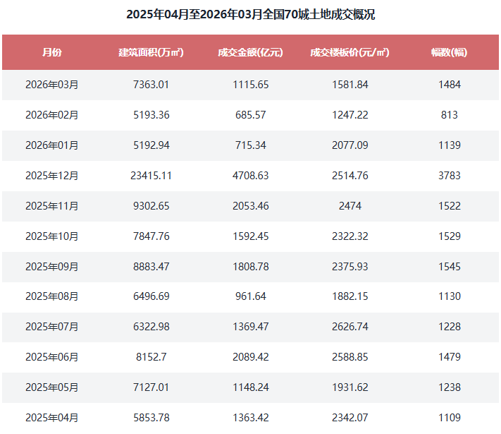 根据优采大数据云平台监测的土地数据,2026年3月全国70城经营性土地数据共成交1484幅,环比82.53%;成交建筑面积7363.01万㎡,环比41.78%;成交总价1115.65亿元,环比62.73%。