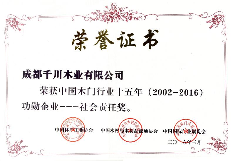 奖项名称: 中国木门行业十五年(2002-2016)功勋企业-社会责任奖