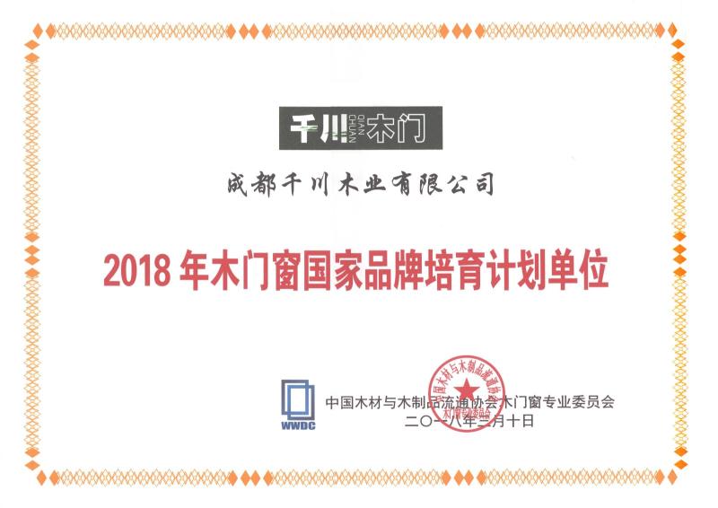 奖项名称: 2018年木门窗国家品牌培育计划单位