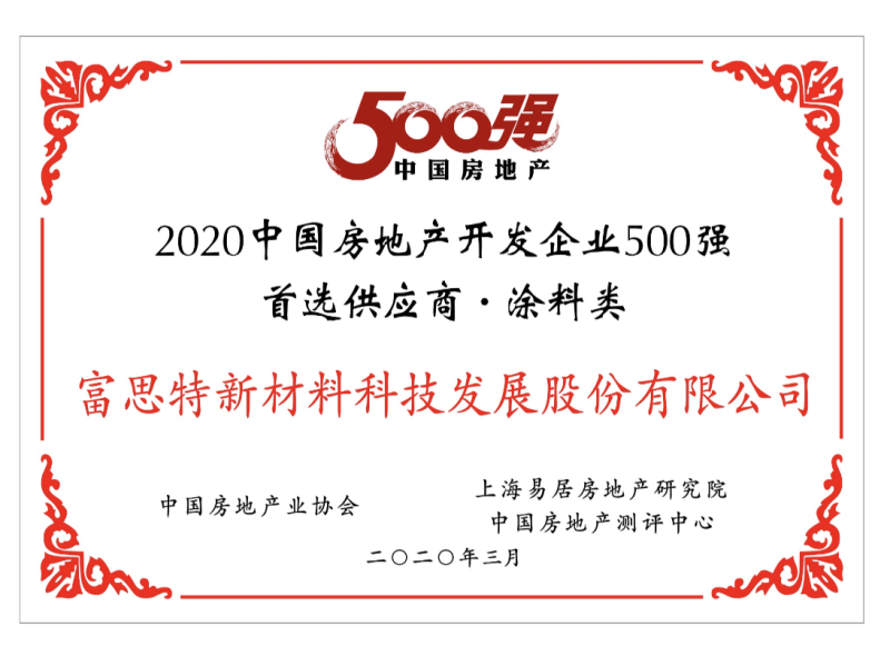 奖项名称: 2020中国房地产开发企业500强首选供应商—涂料类 颁发机构: 中国房地产业协会 2020年03月18日 奖项说明: 2020中国房地产开发企业500强首选供应商—涂料类