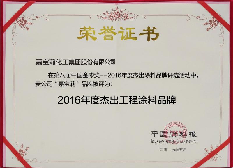 第八届中国金漆奖2016年度杰出涂料品牌评选活动中,被评为2016年度杰出工程涂料品牌