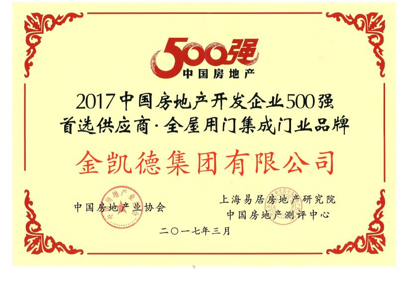 奖项名称: 2017年中国房地产开发企业500强首选供应商 颁发机构: 中国房地产业协会/上海易居地产研究院/中国房地产测评中心 2017年03月01日 奖项说明: 2017年中国房地产开发企业500强首选供应商.全屋用门集成门业品牌