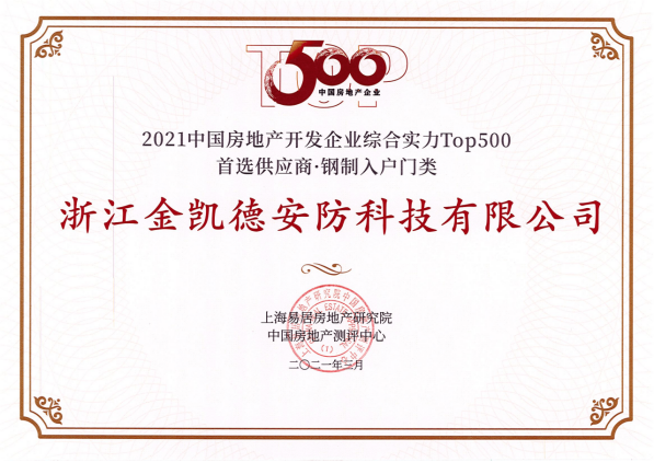 | 奖项名称: | 2021中国房地产开发企业综合实力Top500首选供应商·钢制入户门类 |
