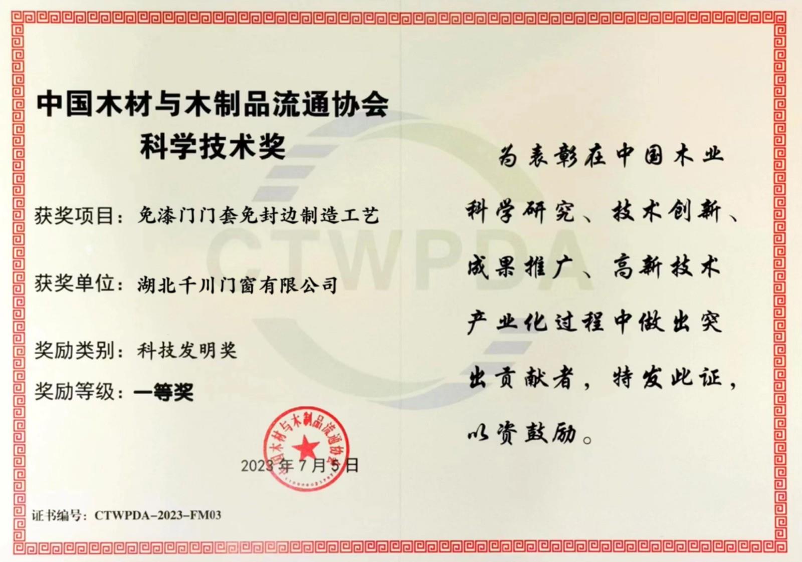 奖项名称: 科技发明奖 颁发机构: 中国木材与木制品流通协会 2023年07月05日 奖项说明: 获奖项目:免漆门门套免封边制造工艺