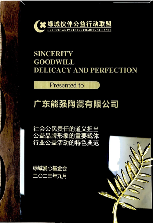 奖项名称: 绿城伙伴公益行动联盟 颁发机构: 绿城爱心基金会 2023年09月01日 奖项说明: 广东能强陶瓷有限公司荣获绿城爱心基金会颁发社会公民责任的道义担当-公益品牌形象的重要载体-行业公益活动的特色典范称号