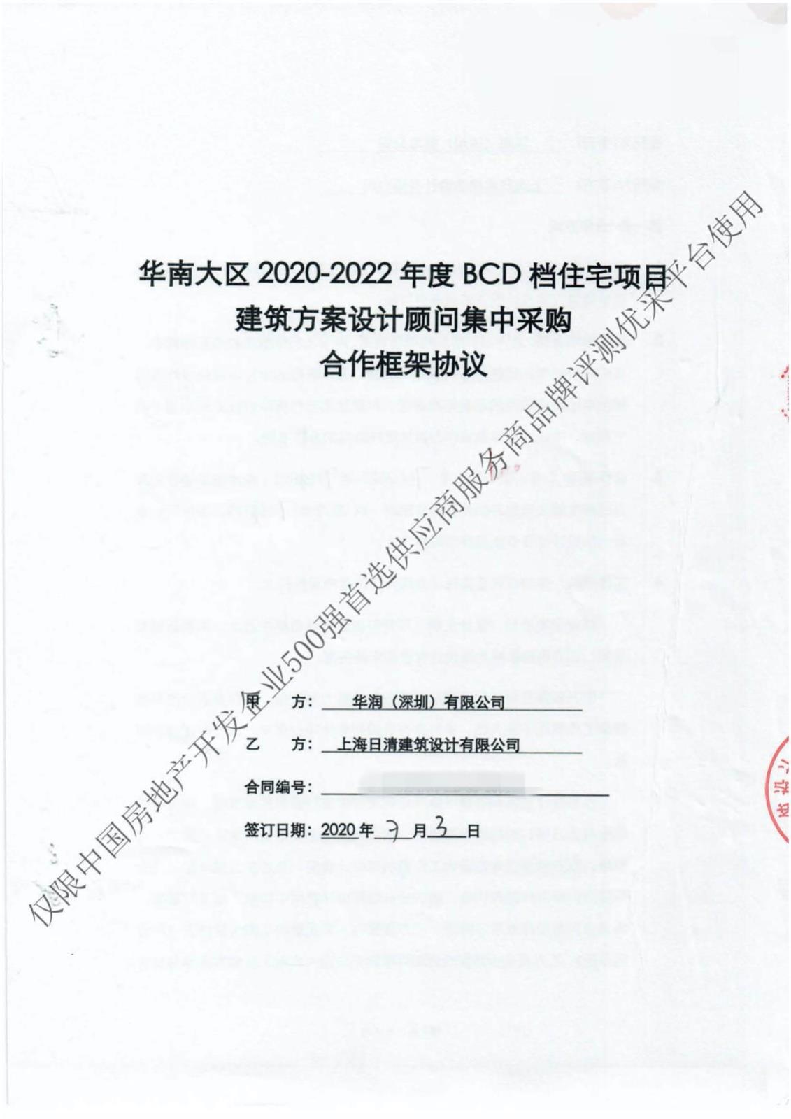 开发商名称: 华****限公司 战略合作名称: 华****020-2022年度BCD档住宅项目建筑方案设计顾问集中采购合作框架协议 战略合作类别: 建筑/规划设计 战略合作期限: 2020年07月03日至2022年07月31日 战略合作范围: 1. 服务范围:华润置地华南大区BCD档住宅项目建筑方案设计服务。包括:拿地强排设计 ...... [登录可见]