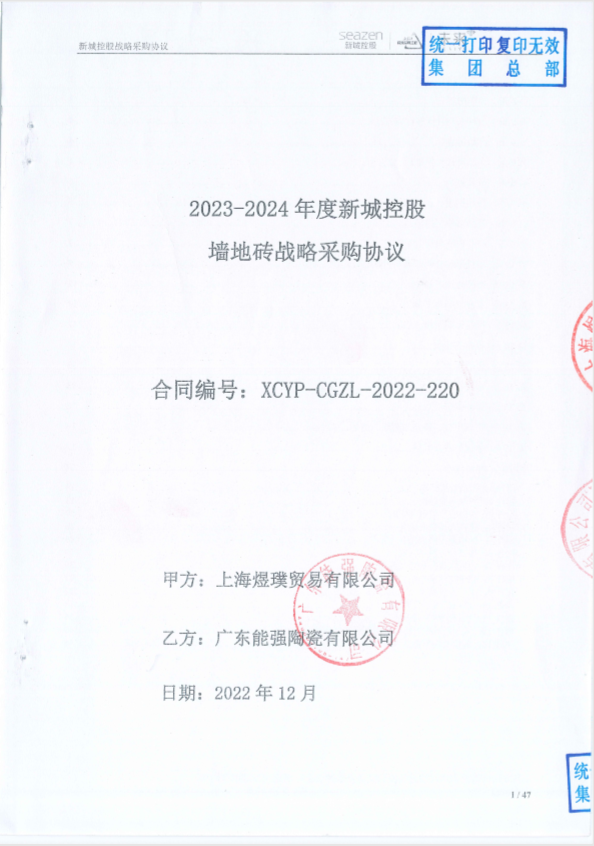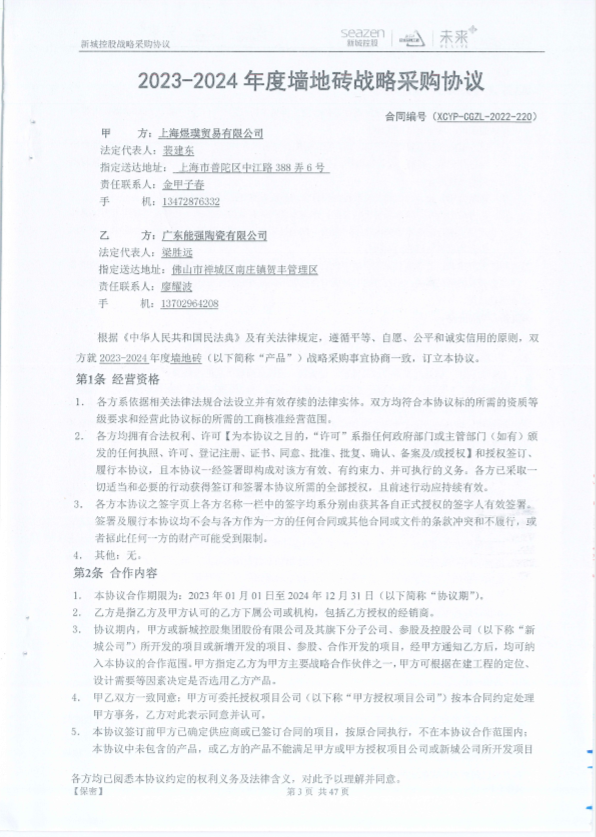 | 战略合作名称: | 2****2024年度新城控股墙地砖战略采购协议 |
