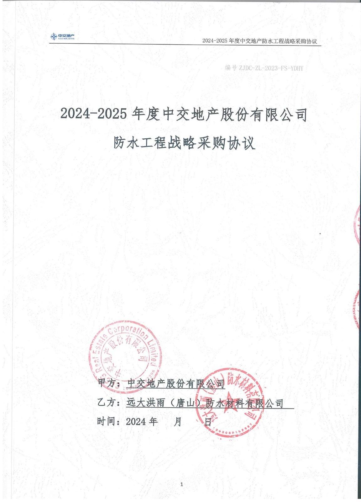 | 战略合作名称: | 2****2025年度中交地产股份有限公司防水工程战略采购协议 |