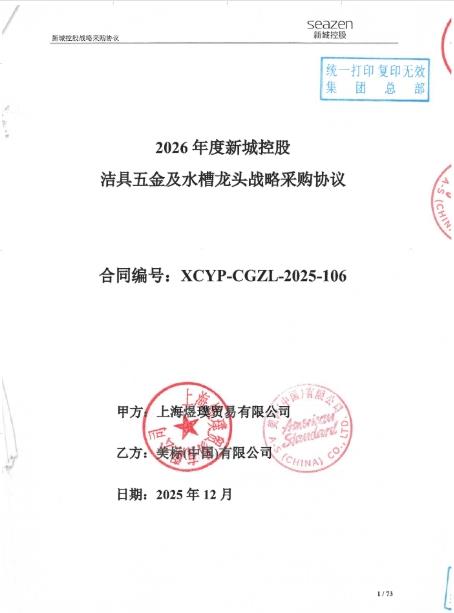 | 战略合作名称: | 2****度新城控股洁具五金及水槽龙头战略采购协议 |