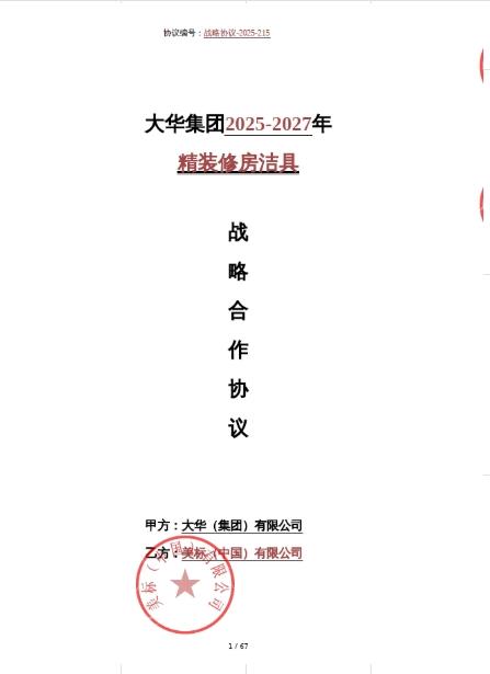 | 战略合作名称: | 大****025-2027年精装修房洁具战略合作协议;2025-2027年度卫浴龙头及花洒战略协议 |